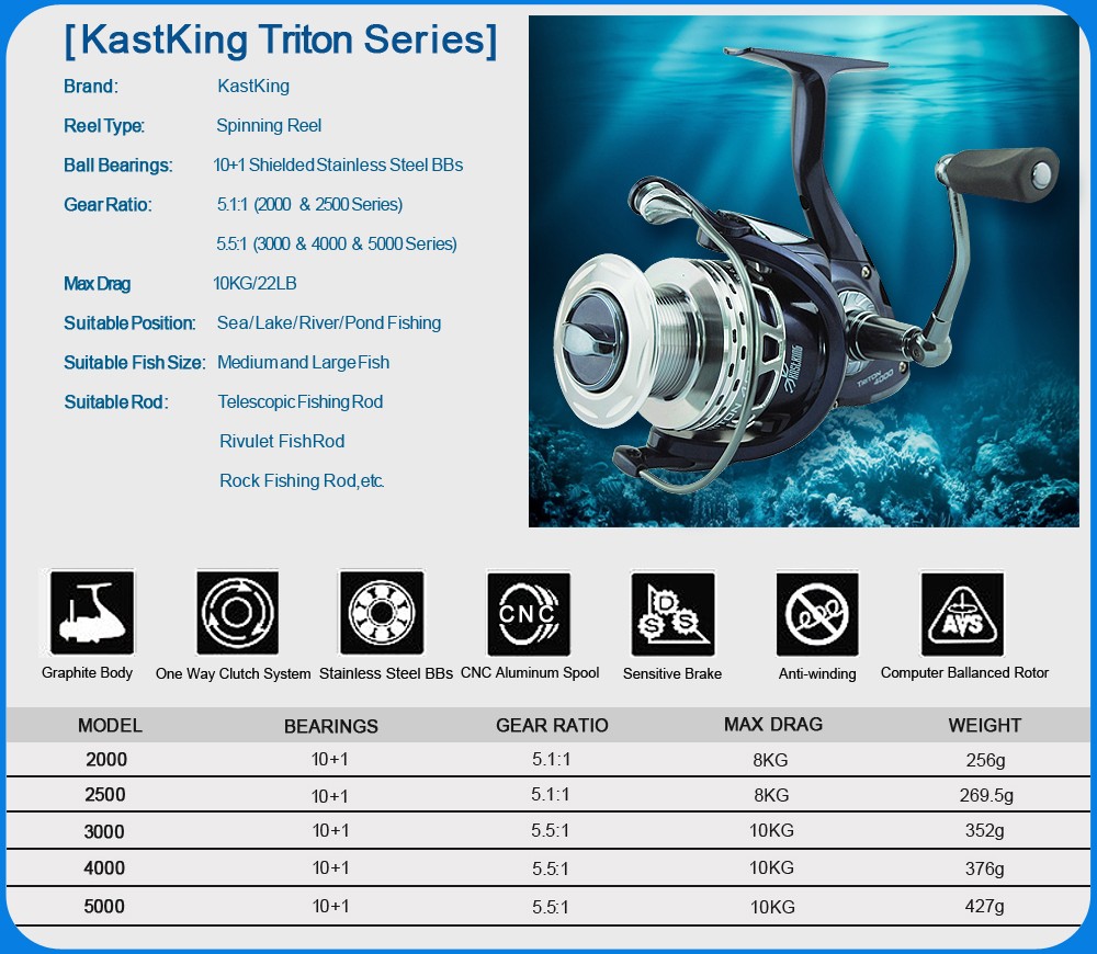 The KastKing® Triton spinning fishing reel is the superb performance equipment priced for anglers even if entry degree or a pro fisherman. It delivers extra bang on your fishing buck than some other reels in its measurement. It’s a KastKing® best promoting spinning reel for a fierce pursuit of a very good video game fish fight. KastKing® Triton spinning reels are able for freshwater fishing or saltwater fishing. Put a Triton reel on a KastKing® spinning fishing pole these days – it’s the superb inshore rod and reel combo.